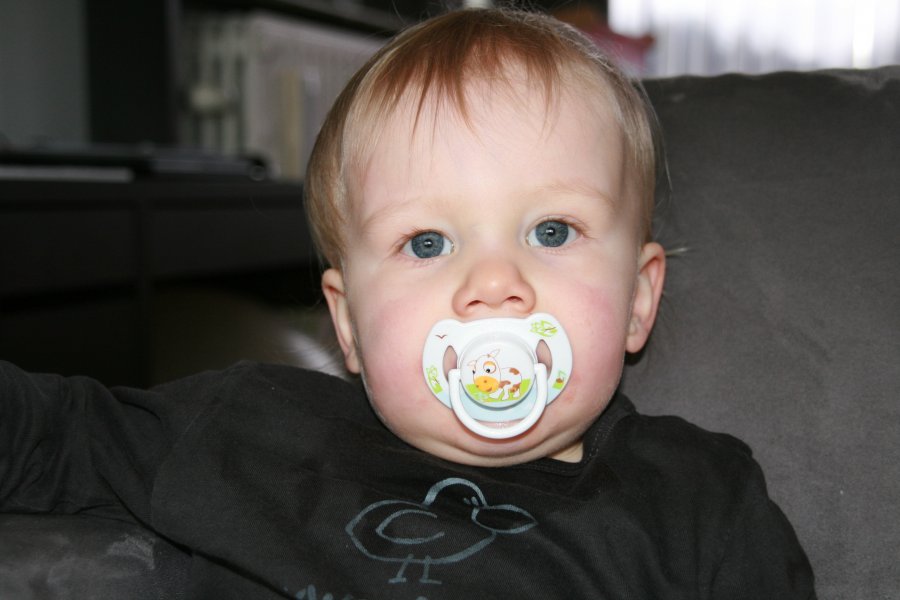 Kapper Jan zette mij in de speciale kinderstoel met stuurtje. Echt blij was ik niet, ik trok mijn lipje naar beneden. Na twee minuutjes vond ik het niet zo leuk meer. Mijn tutje hielp me niet om mij te troosten. Al wenende heeft Jan mijn haartjes geknipt. Omdat ik heel braaf stil bleef zitten, kreeg ik van Jan toch een 10 op 10. 🙂